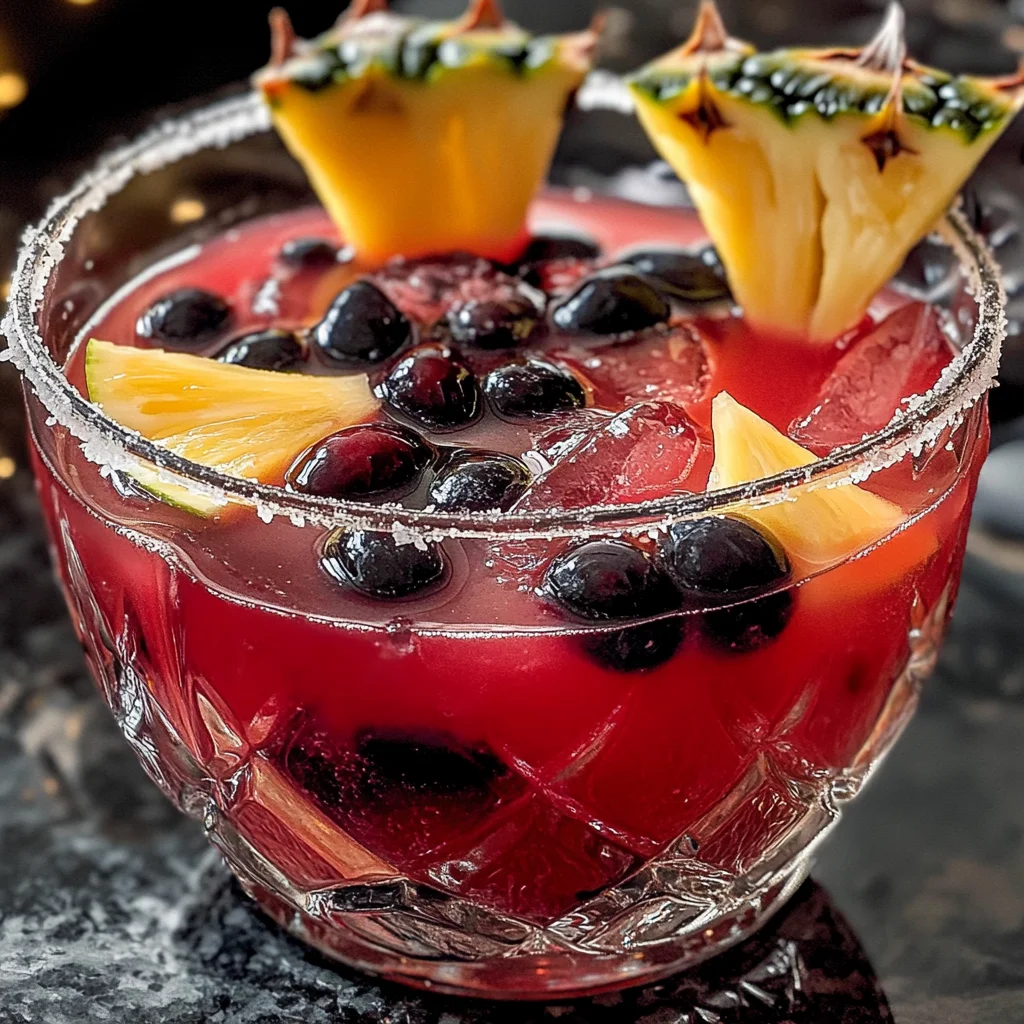 - In a punch bowl, mix together cranberry cocktail juice, orange juice, pineapple juice, and blueberry juice until well combined.